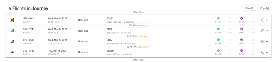 Grymt! Blir nog att köra på den, har en polare i Paris så skulle kunna passa på att ta ett snabbt besök. Stort tack!Verkar som att utgå från SYD är väldigt, väldigt svårt i BIZ, men från MEL finns det gott om tillgång till BKK med Thai.