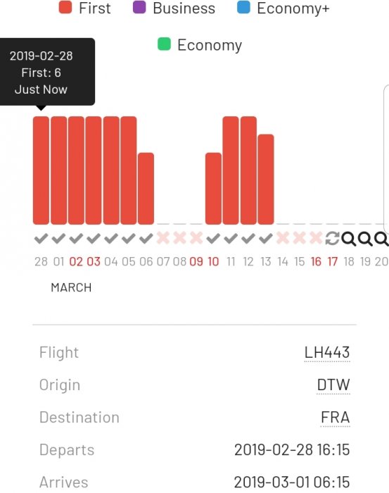Inte ofta man ser 7+6 platser!Ett tips för den som vill åka LH F till USA är att de fram till 30/3 kör en 340 med First till Detroit. Gott om platser åt bägge håll både i F och C.