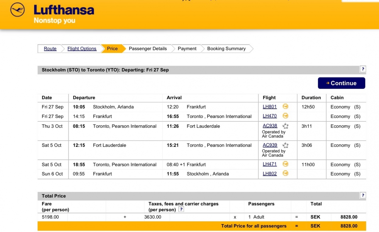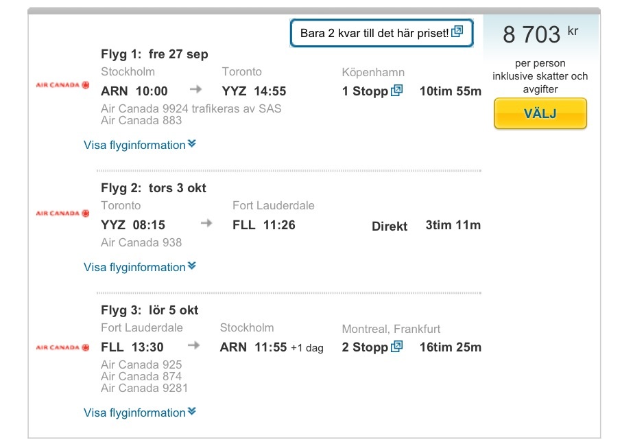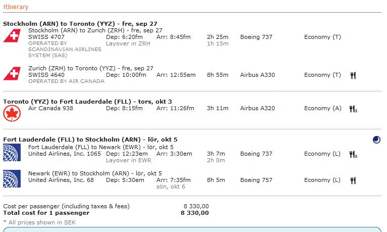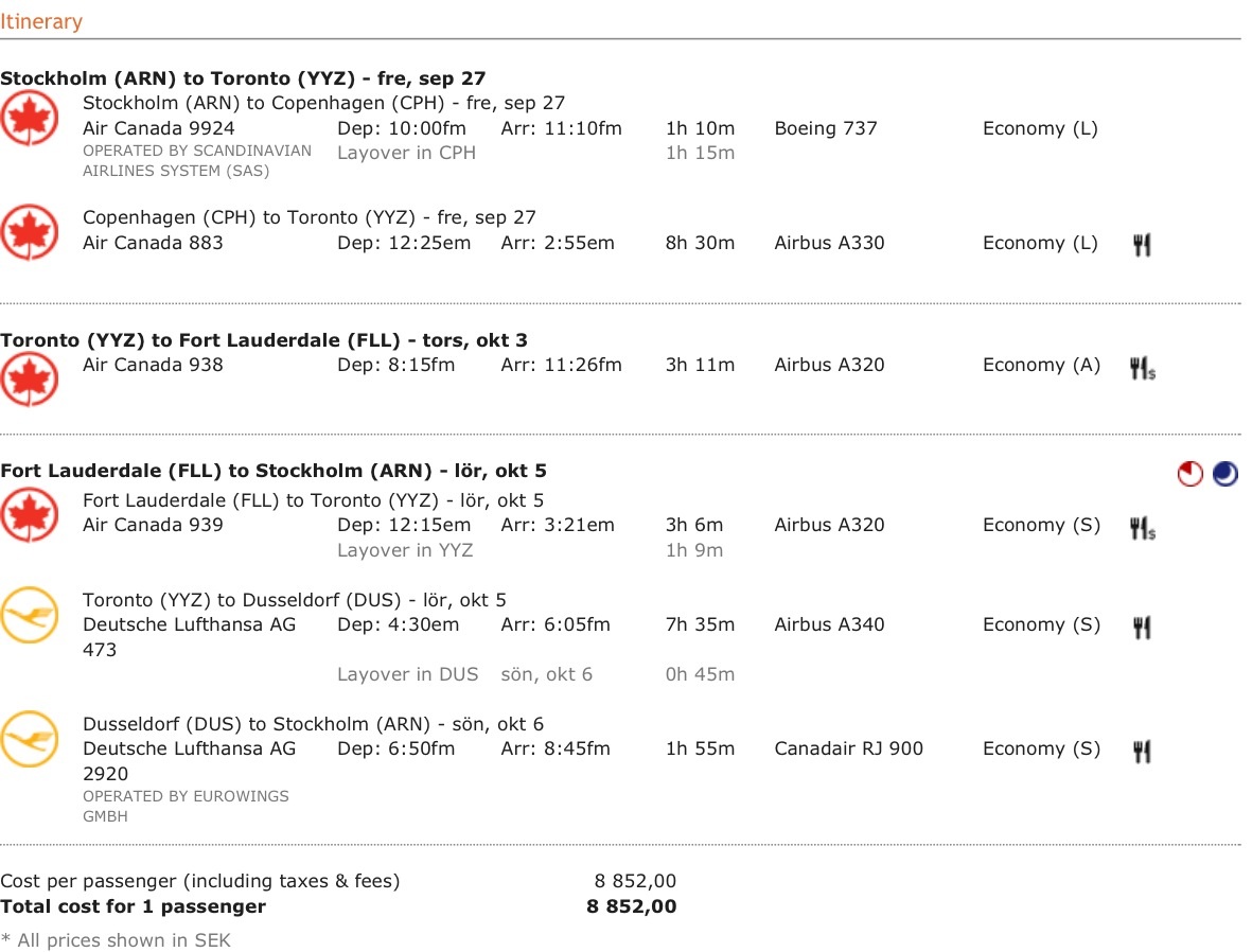 Varifrån vill du börja din resa?ARN Var är din destination?YZZ och FLL När vill/behöver du resa ut?från ARN 27/9, från YYZ 3/10 När vill/behöver du komma hem?6/10 Hur länge vill du vara borta? Hur många personer som skall resa?2 I vilken kabinklass?Eco Med vilka flygbolag vill du flyga med?gärna Star Alliance (EBG) Vad är din budget?10-12 Vad är det viktigaste för dig?undvika USA på utresan Vill du stanna annanstans utöver destinationen?