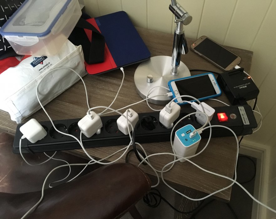 Grenuttag har nämnts tidigare. Jag brukar ha en liten splitter 1->2 uttag för longhaul-flighter där economy pax förväntas dela på ett uttag med, ibland, en annan passagerare. Den brukar också räcka till hotellrummet för att ladda dator/telefon.