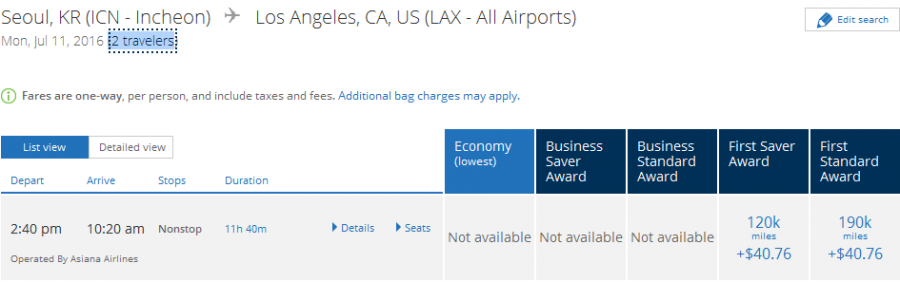 Till och med två First class awardplatser mellan Seoul-Los Angeles.