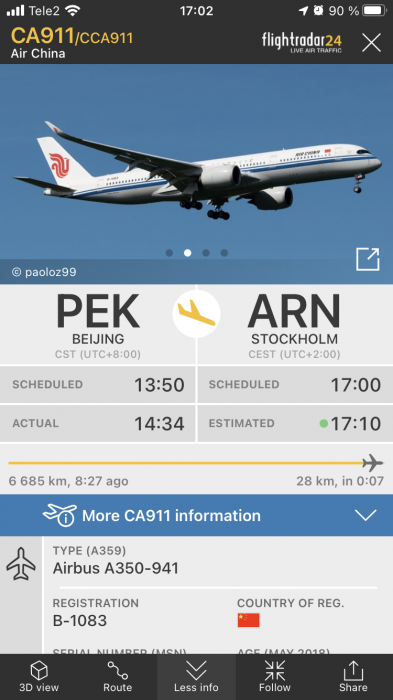 Jag sitter på CA6832 SAS flyget från Göteborg till Stockholm. Därifrån ska jag ta CA 912 till Peking.