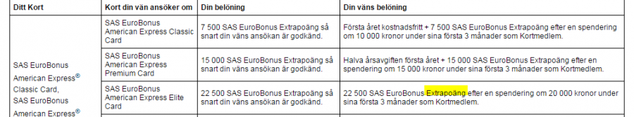 Saknar 12 000 baspoäng för nivå Guld. Gick i tankar om att skaffa AMEX Elite för de 20 000 statusgrundande poängen. Men som den nya villkoren för att bli inbjuden av en vänn stämmer inte överens med andra sidan då de där står att man får extrapoäng.