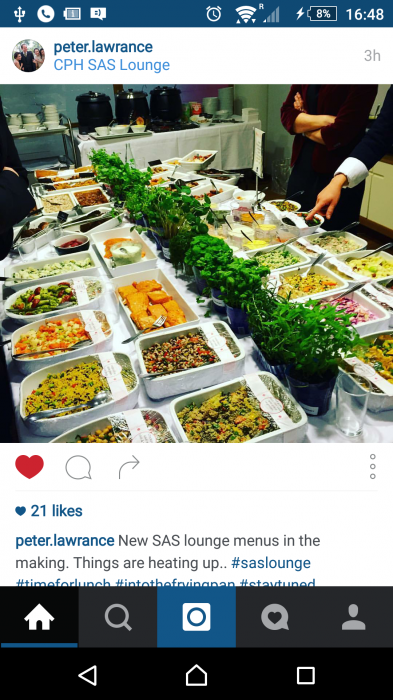 På T4 vid samma tid fick vi hålla tillgodo med morots- och gurkstavar med guacamole och humus. Åtm något bättre än bara potatischips...Idag serveras lax och pastasnäckor i SAS Gold Arlanda T5. Skönt med variation.
