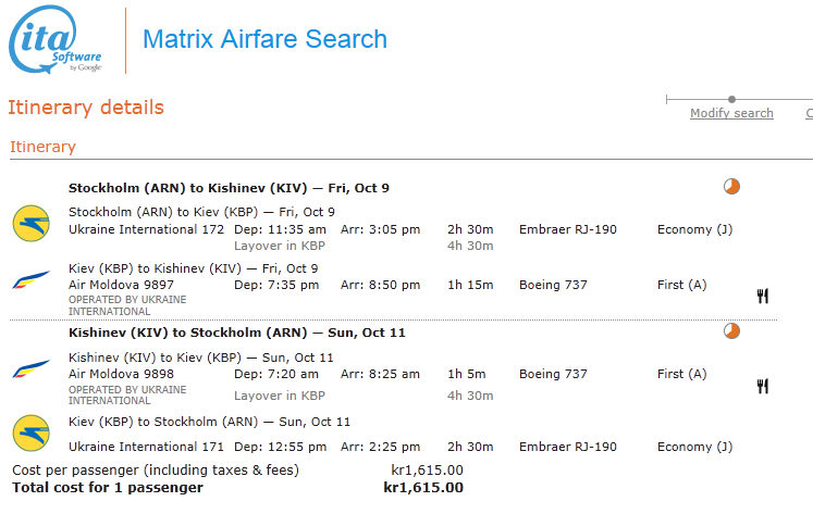 Det är som vanligt, ITA Matrix mappar bokningsklasser fel.Någon som vill följa med till Moldavien i oktober - fantastiskt pris med First