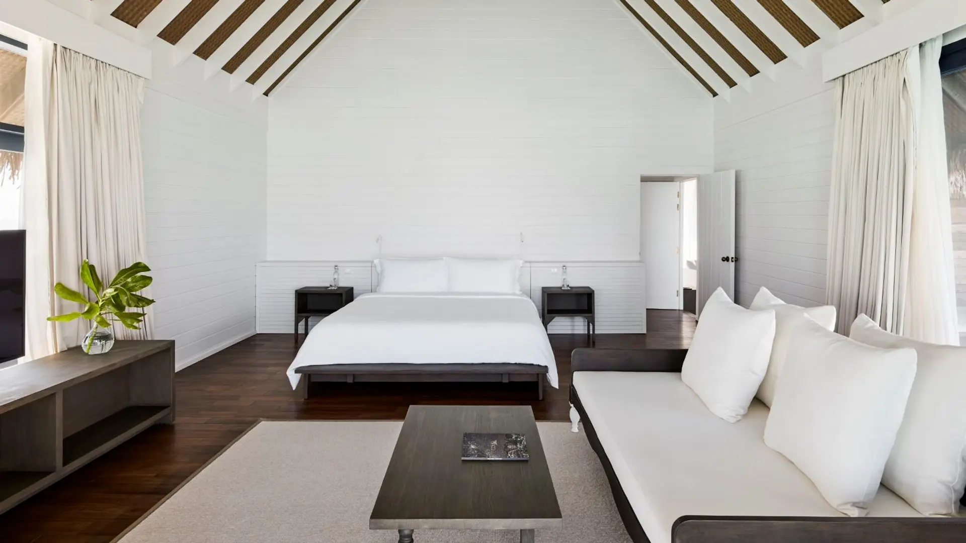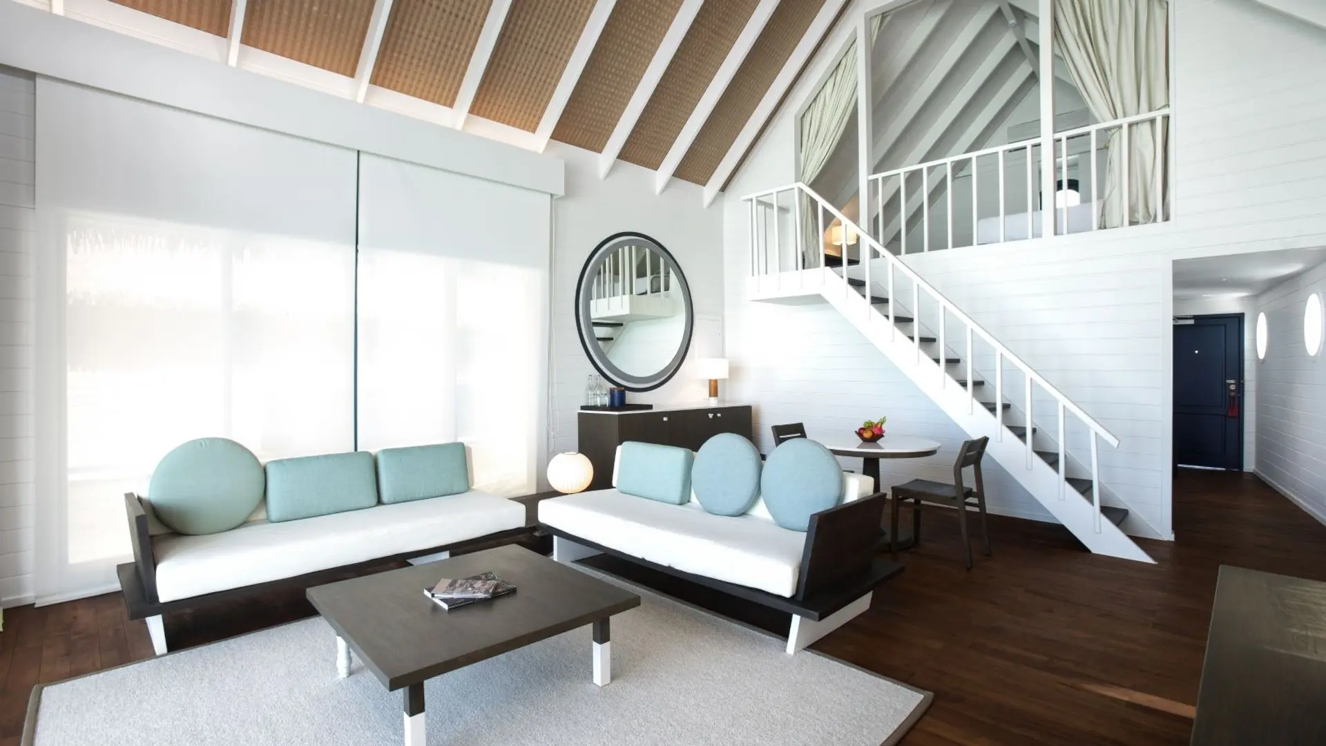 The Dhoni Water Villas are split level and shaped like a traditional Maldivian fishing boat. Offering a generous 75 square metres of living space with private decks with loungers and dining tables and stairs down to the ocean, the space is sleek and clean lined in a monochrome colour palette with a vaulted ceiling and floor to ceiling windows opening out onto the deck and the ocean beyond. The Dhoni Loft Water Villas (110 square metres) follow a similar design but have a larger living space ideal for families downstairs whilst the master bedroom is upstairs.