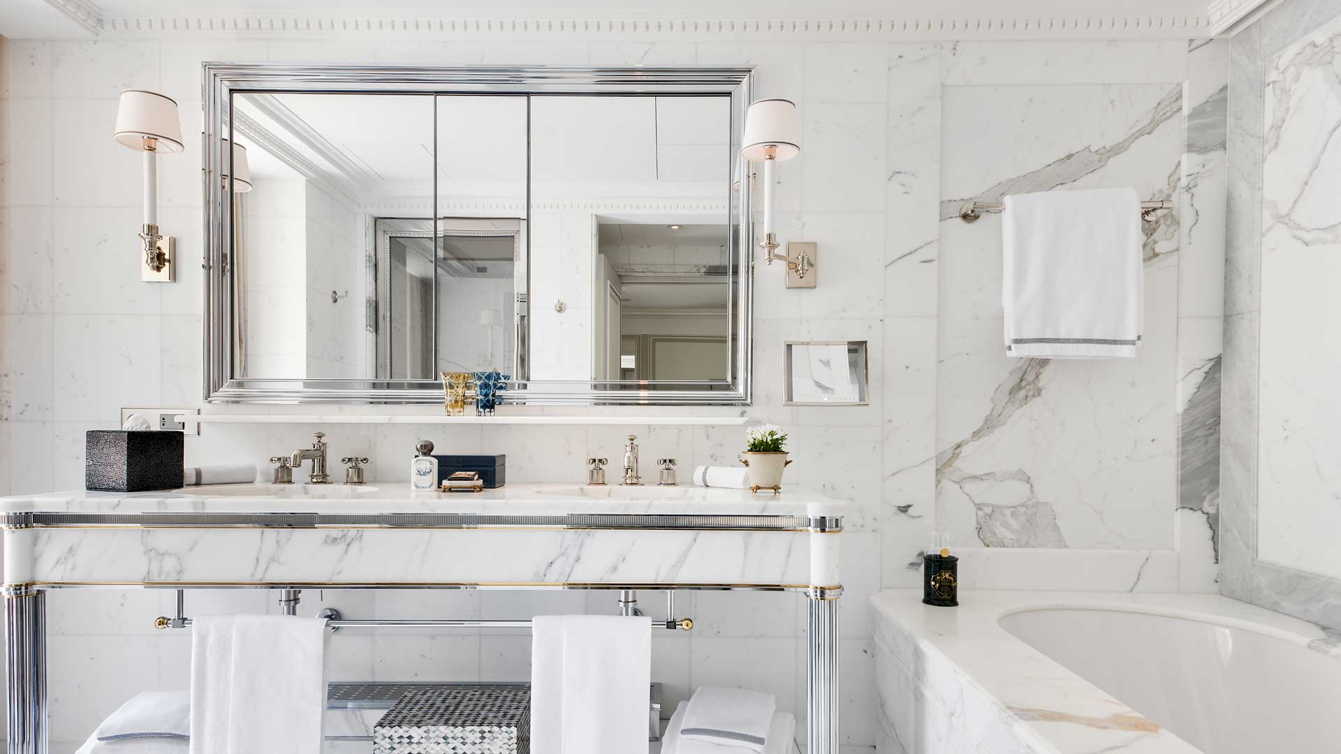 Karl’s two Grands Appartements are located on the fourth floor, offering breath-taking views over the Place de la Concorde, decorated with an elegance that can only be created by the touch of a master designer with an interest in history. Attention to detail was sacrosanct and included the recreation of the fabric for the canopy bed in one of the Appartements, inspired by a scrap of silk remaining from the time of Louis XVI. He also incorporated some secret doors inspired by Versailles and included original sinks from that palace in the power room. A mix of bespoke furniture, grey silk wallpapers, damask fabrics, glittering chandeliers, curated fine antiques with incredible bathrooms made from blocks of Carrera marble, dining rooms and ultra-contemporary dressing rooms, the two Grands Appartements can be combined together with an adjoining bedroom to create a three-bedroom apartment.