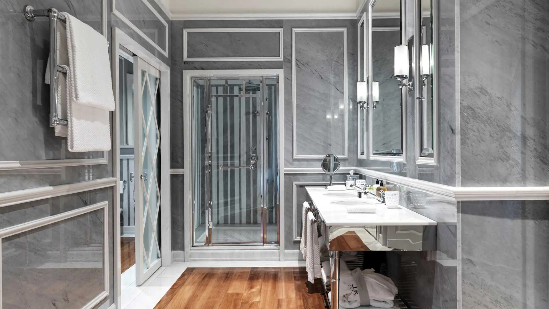 The Superior Balcony Rooms offer a tad more space at 22 square metres, the Superior Double Room is again slightly larger at 26 square metres of space with the Deluxe Double Rooms sized at 32 square metres and featuring handmade fabric beds and either wooden cabinets or walk in closets. The JK Deluxe and JK Deluxe Balcony Rooms offer 40 square metres of living area and are particularly comfortable with handmade fabric beds, sleek furnishings and Dior grey walls. Leaping up in scale, the Grand Deluxe Rooms offer 42 square metres of quiet luxury and privacy facing the courtyard. These can be interconnected with other rooms to expand the space as required.
