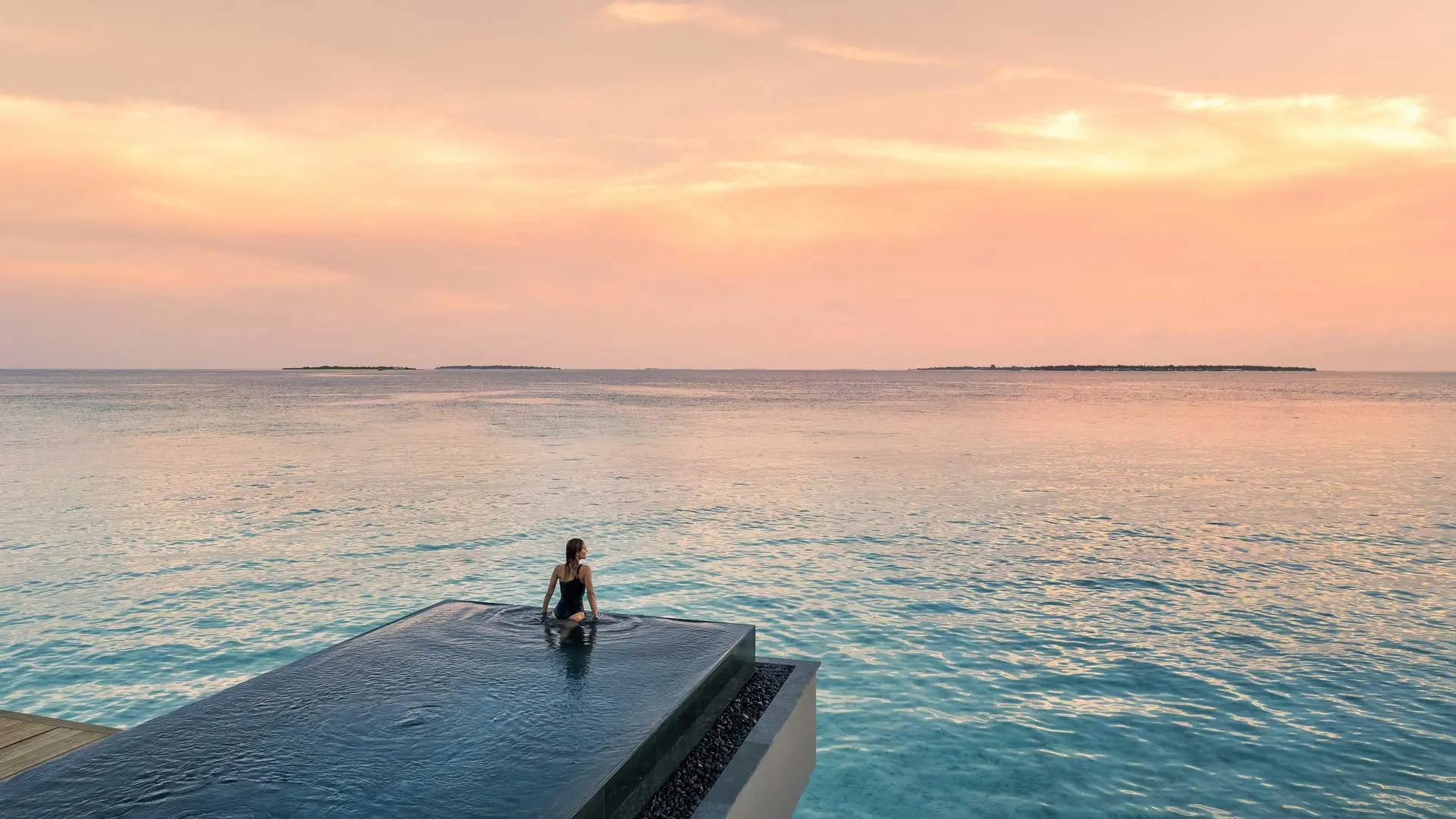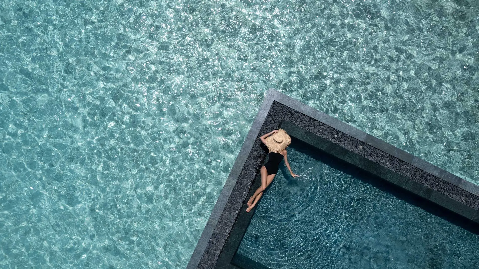 By using biophilic design principles, the design of the guest accommodation is intuitive and flowing, evoking harmony and balance. The 87 square metre Ocean Pool Villas are a vision of aquatic colours in the bathrooms from the floor to ceiling screens, to the shimmering ceilings and the classic marble flooring whilst the living space offers calm, neutral hues with contemporary custom furnishings, rattan chairs and are awash with light from floor to ceiling windows. Everything here is cool, calm and collected – from the central stand along bathtubs to the draped netted beds – and the wooden decks with sleek seating and loungers under parasols, outside dining tables, netted hammocks, 33 square metre infinity pools and steps down to the azure blue ocean - symmetry being king. The Sunset Ocean Pool Villas follow a similar style but are orientated for those sweeping sunset vistas.