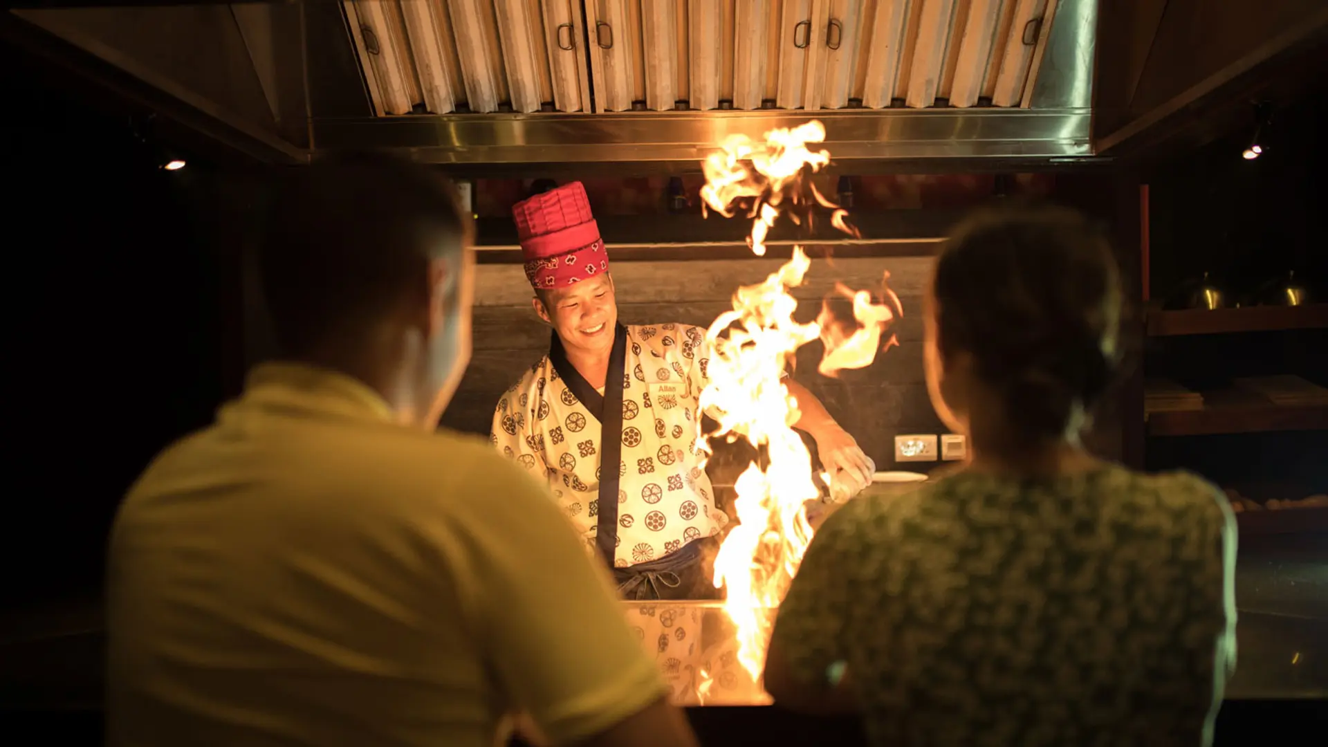 Umami, also open for dinner only, enjoys a contemporary design to fit a menu of gastronomic Japanese dining at its best. With chefs entertaining with their knife skills, enjoy fresh sashimi, nigiri and maki at the cobalt blue bar, Kobe beef and Australian lamb at the robata grill or speciality teppanyaki. To accompany the meal, choose from over 30 sakes or fine Japanese whiskeys. This restaurant serves some of the finest Japanese cuisine in the Maldives.