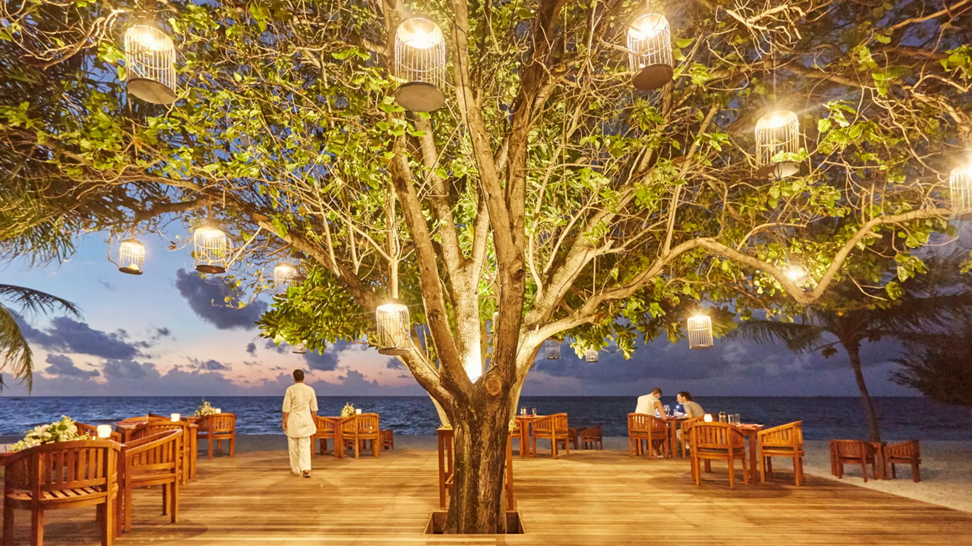 Mixe is the main restaurant for breakfast and dinner, serving international cuisine served from live cooking stations, serving freshly made wood fired pizzas and succulent stir fries. Set on a sandy beach, the restaurant has slow-turning fans for cooling the salty fresh breezes. The weekly Maldivian-themed evening is a huge hit.
