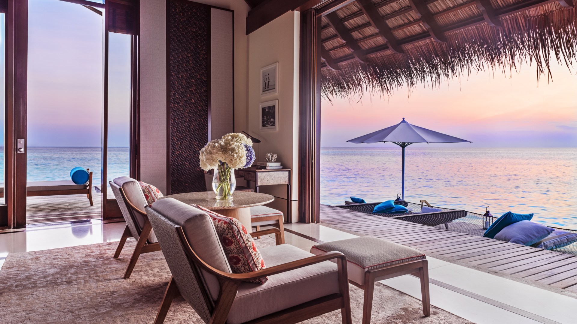 Gathy’s design is contemporary, intertwining traditional Maldivian elements and tropical woods with subtle Balinese touches. There are vaulted wooden ceilings, polished marble floors, textured rugs, high wooden ceilings and trim, wooden shutters, mid-century modern furniture and crisp white linens. For island exploration, there are custom One&Only bicycles waiting at the villa for each guest.