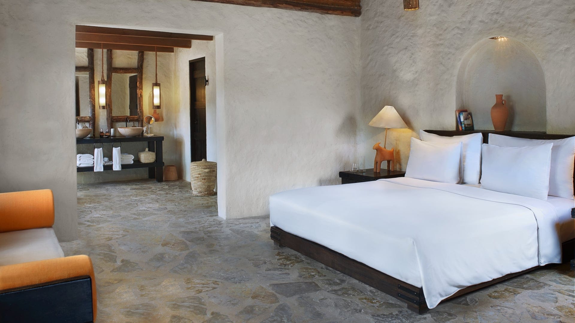 The Omani-style dwellings offer a cosy cushioned living area, cool under high traditional-style ceilings, antique lanterns offering soft filtered light, oversized terracotta bathtubs and an organic Naturalmat bed made with fine unbleached cotton sheets topped with a choice of ergonomic pillows. A natural colour palette is enlivened by touches of burnt-orange soft furnishings.